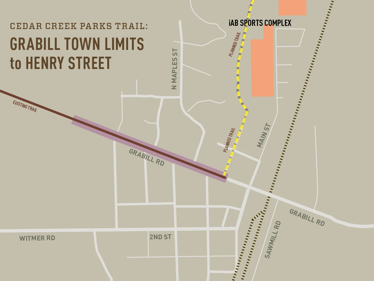 Fort Wayne Trails is partnering with Grabill and the NewAllen Alliance. A 10′ wide trail on the north side of Grabill Rd. will be built from the western town limits to Henry St. This is a part of the NewAllen Alliance Stellar Portfolio from 2019-2023. DLZ has completed the feasibility study. This trail will connect to the existing trail on Grabill Rd and connections to the Riverside Gardens.
