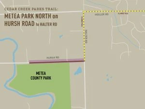 Starting at the Metea Park North Trailhead on Hursh Road, this  10′ trail will continue on the south side from the trailhead to the AEP corridor, make a mid-block crossing and continue on the north side east to Halter Rd. where it will meet with portions of the trail being built by Leo-Cedarville. This is a complementary project with the NewAllen Alliance Stellar Portfolio from 2019-2023.