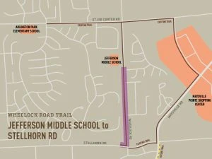 Description: 8ft – 10ft wide asphalt trail on the west side of Wheelock Rd extending from the trail completed in 2020 to the existing trail at Stellhorn Rd and Wheelock Rd.