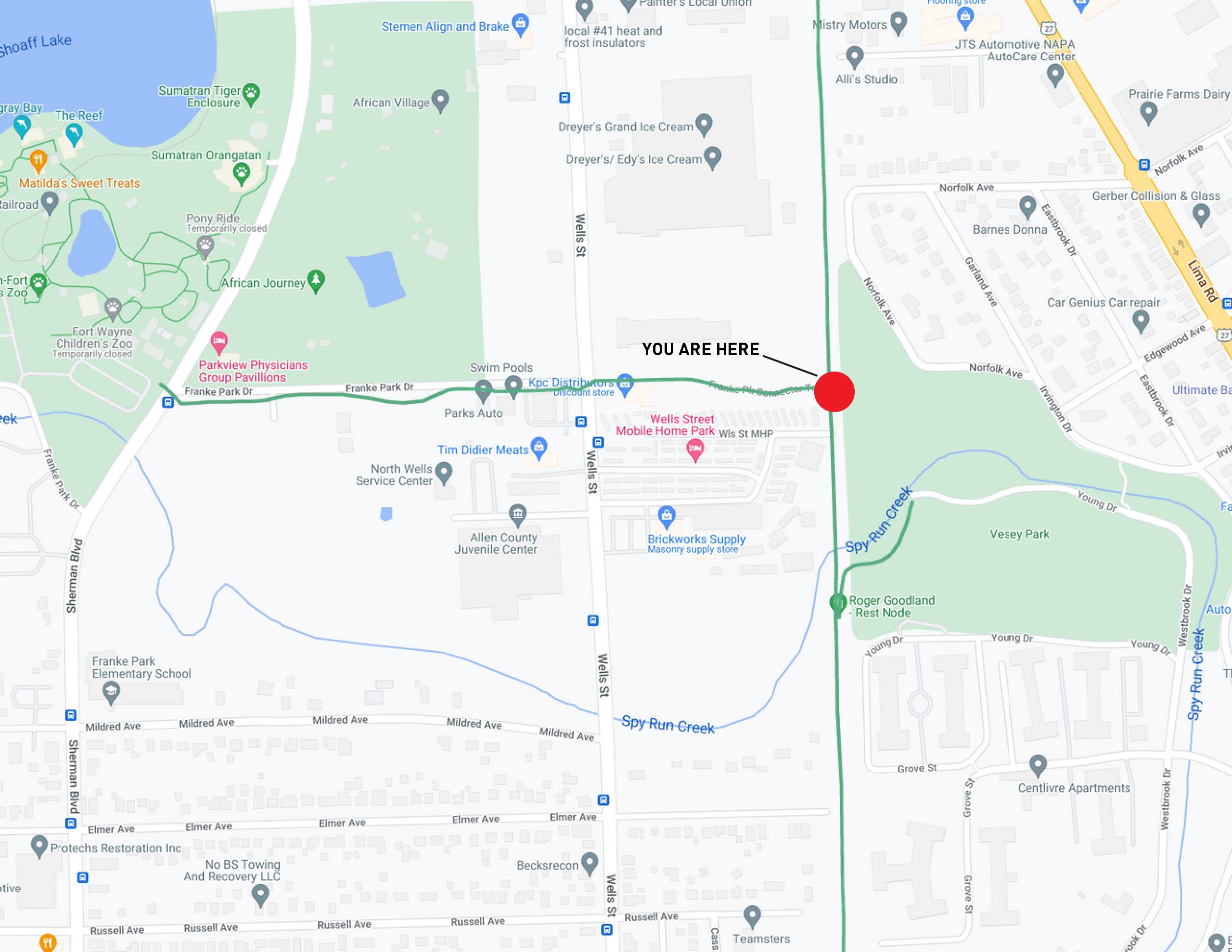 Fort Wayne Children’s Zoo & Franke Park (.45 Miles) – Travel west, cross Wells St, and continue on trail.